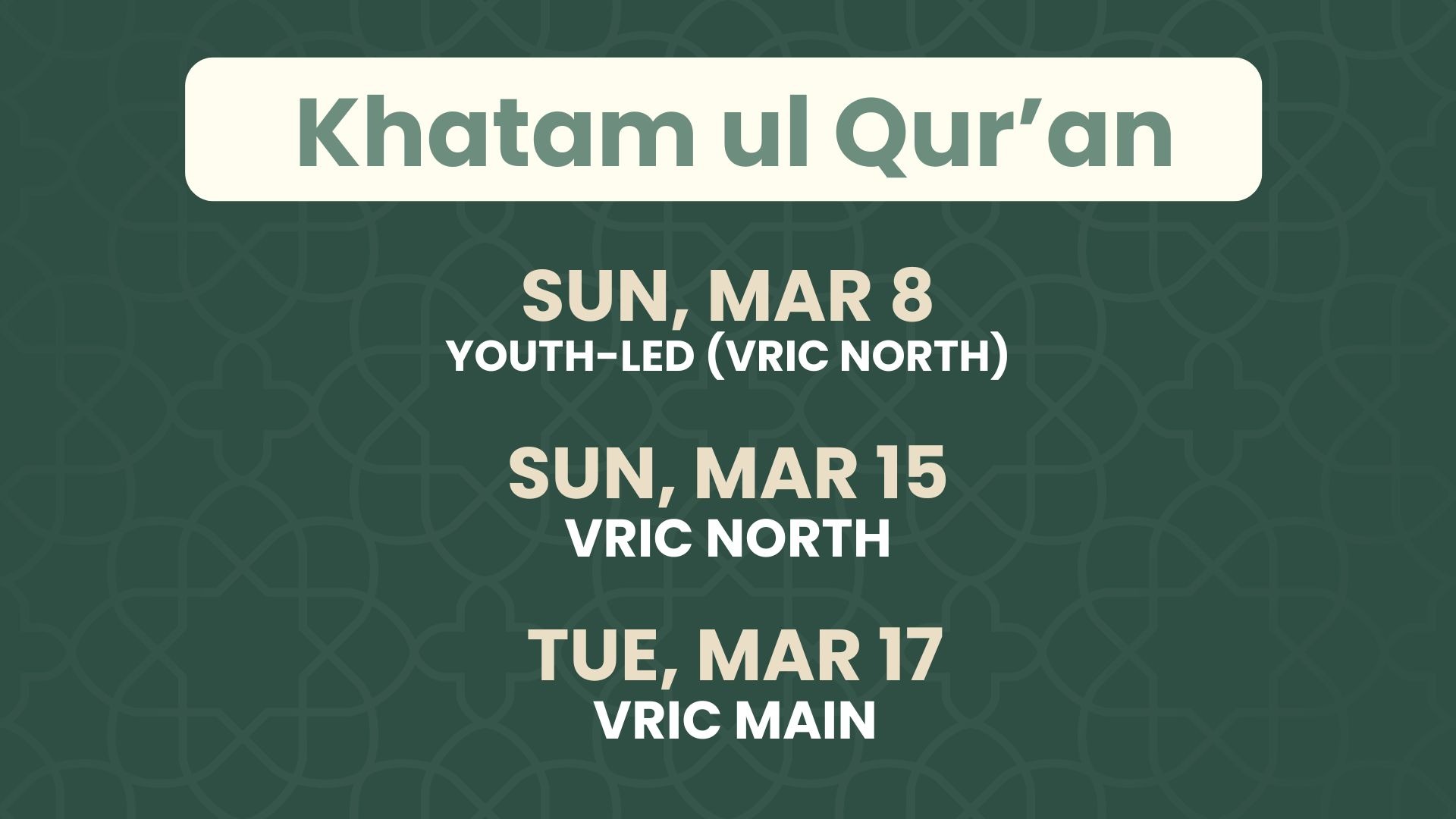 Insha’Allah Youth-Led (VRIC North) Khatmul Qur’an will be Sunday, March 8th